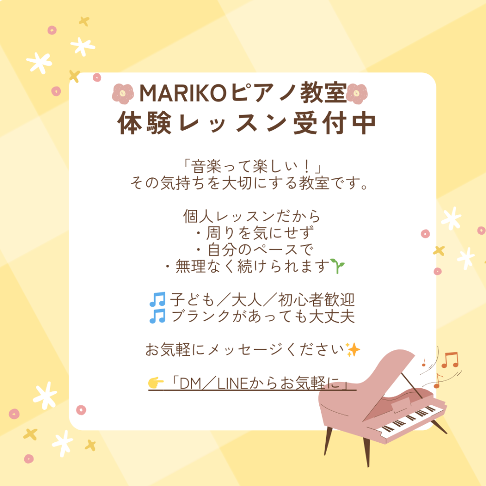 目指すはいつか好きな曲を思いどおりに自分らしく、誰にも頼らず1人で弾けるようになること!ピアノが生涯の友になります。